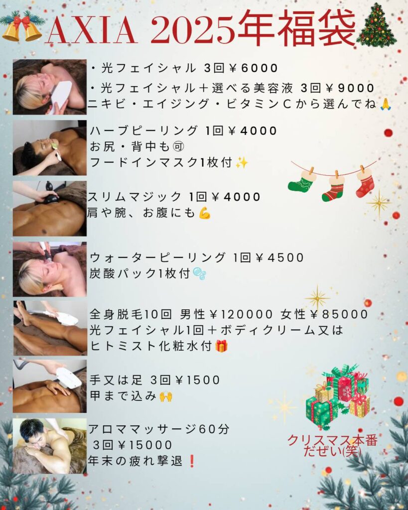 #AXIA博多駅前店#AXIA熊本店#脱毛#博多駅#フェイシャル#福袋#クリスマス#キャンペーン#年末年始#メンズエステ#痩身#アロマ#ハイドラフェイシャル#ピーリング